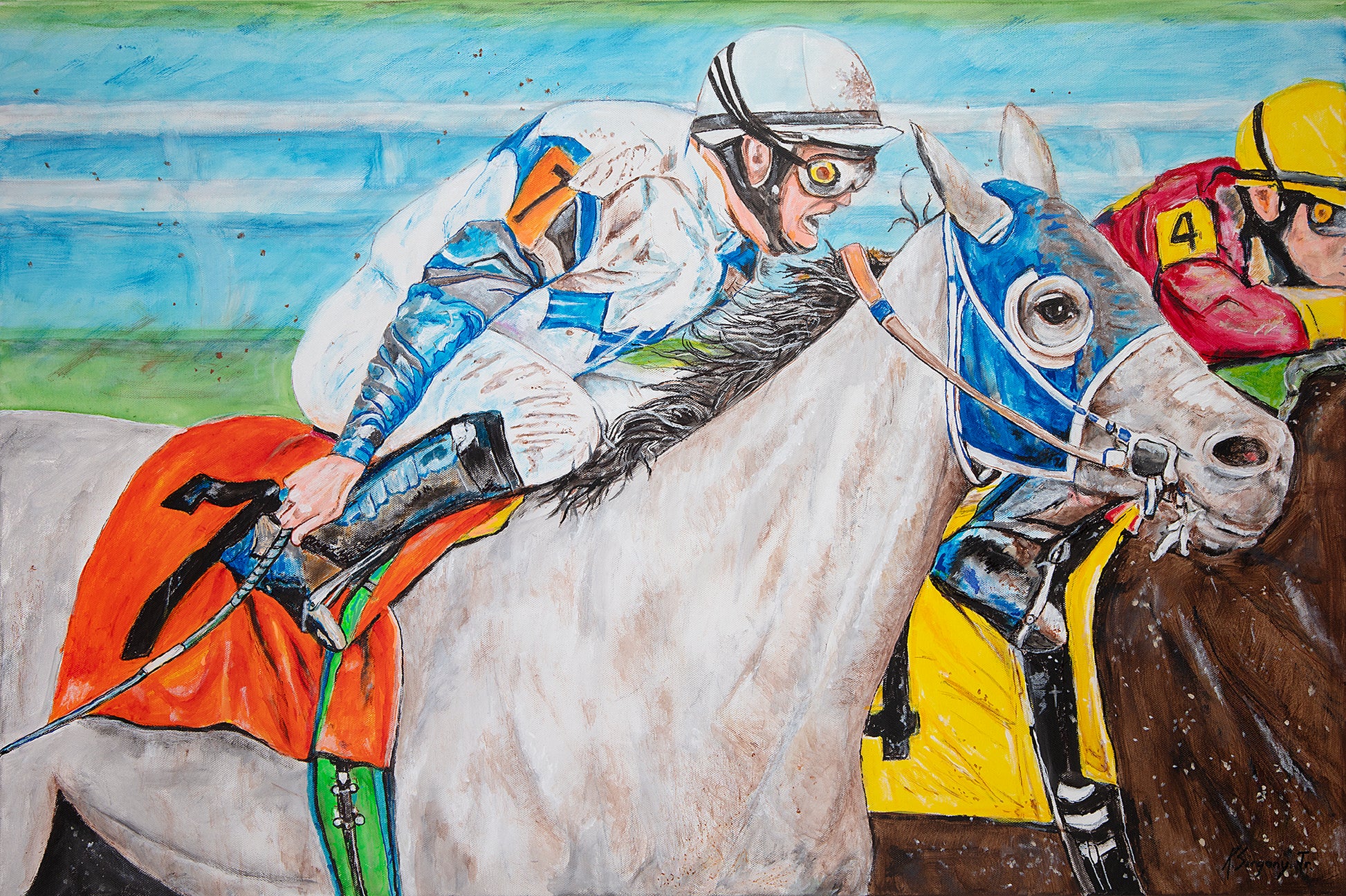 At its core, By a Neck is about the unbearable closeness of outcomes. It honors the space where effort meets uncertainty, where preparation surrenders to chance, and where commitment is tested without mercy. The painting speaks to anyone who has ever pushed to the edge knowing the result might still slip away—not because they were unworthy, but because the margin was impossibly thin.