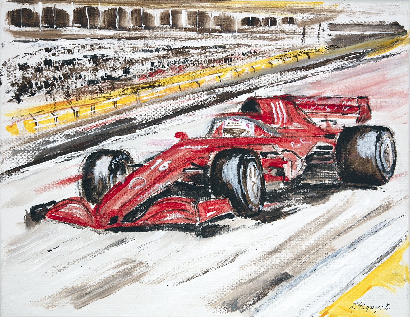 A fiery red racer charging down the track, painted with raw motion and adrenaline.
