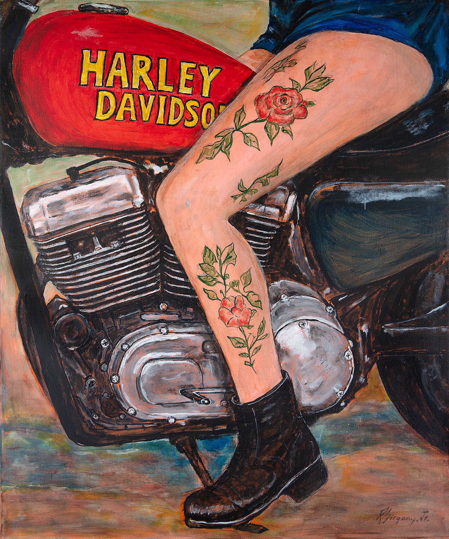 This painting is a study in contrast—where power meets tenderness, and rebellion carries a quiet bloom of intimacy. The composition focuses on a single, decisive moment: a tattooed leg resting against the vibrating heart of a motorcycle. There is no face, no horizon, no destination shown. What matters here is presence—the feeling of weight, heat, metal, skin, and intention coexisting in perfect tension.