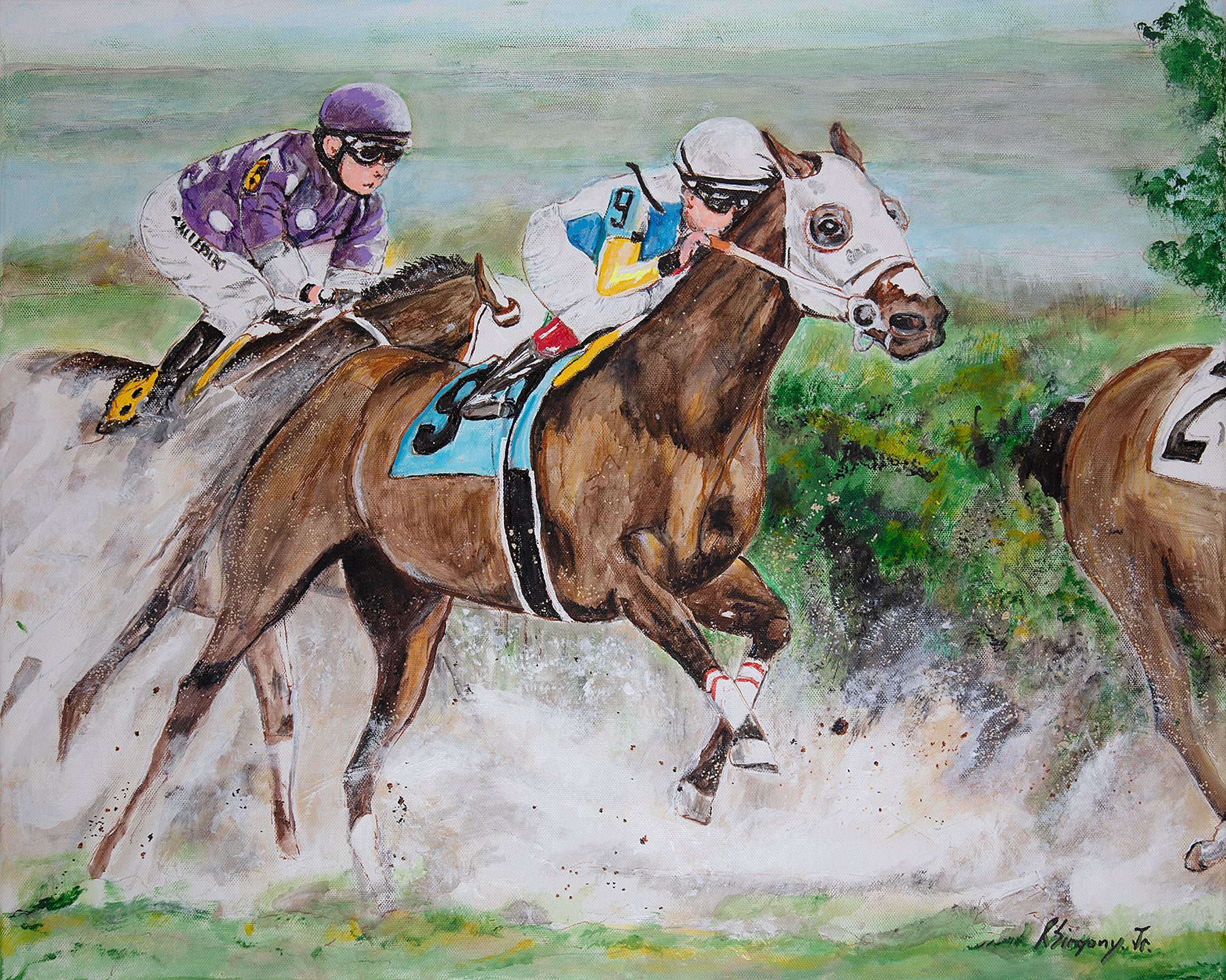 Behind them, a rival presses close, partially obscured by water and motion. The trailing horse and jockey are rendered with equal intensity, reminding the viewer that victory here is contested at every stride. There is no isolation in this moment—every surge forward is measured against another’s will to keep pace. The closeness heightens the tension, making the outcome feel unresolved, balanced on fractions of time and inches of ground.